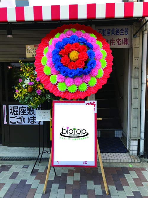 インパクト抜群の【花輪】です。生花ではありませんが、大きさはダントツです!どんなスタンド花よりも注目度は抜群です!